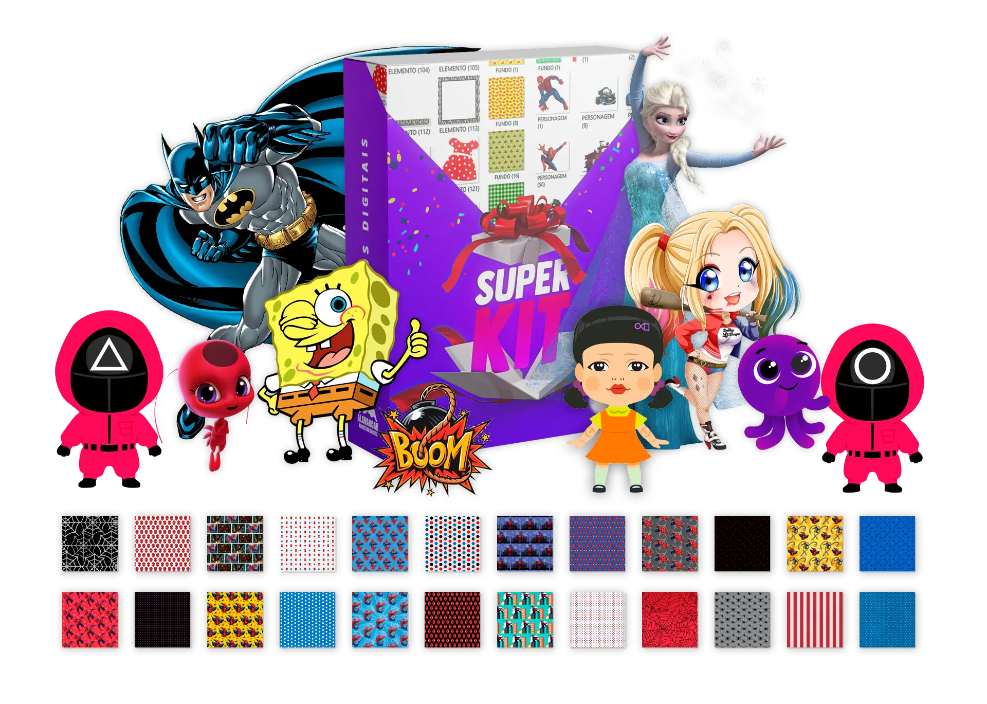 + de 100 Mil arquivos, para você criar suas decorações, papéis de parede, elementos e personagens, e + 11 super pacotes com artes já prontas para você imprimir e montar com os temas mais pedidos!
